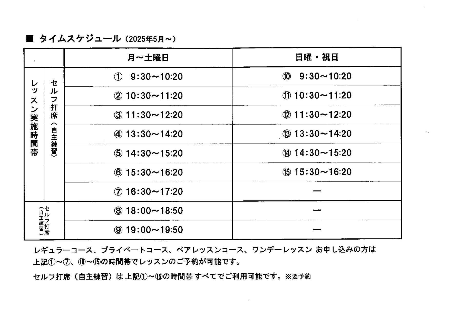 ※レッスンスケジュール(プロの出勤日)、タイムスケジュール(レッスンの時間割)は添付ファイルよりご確認ください。