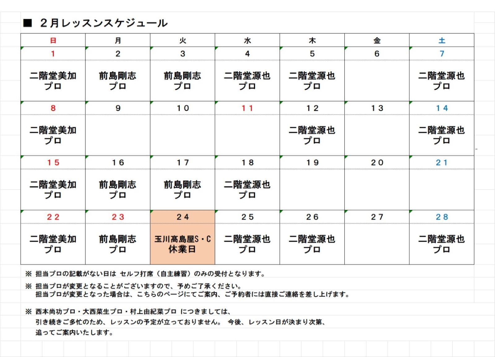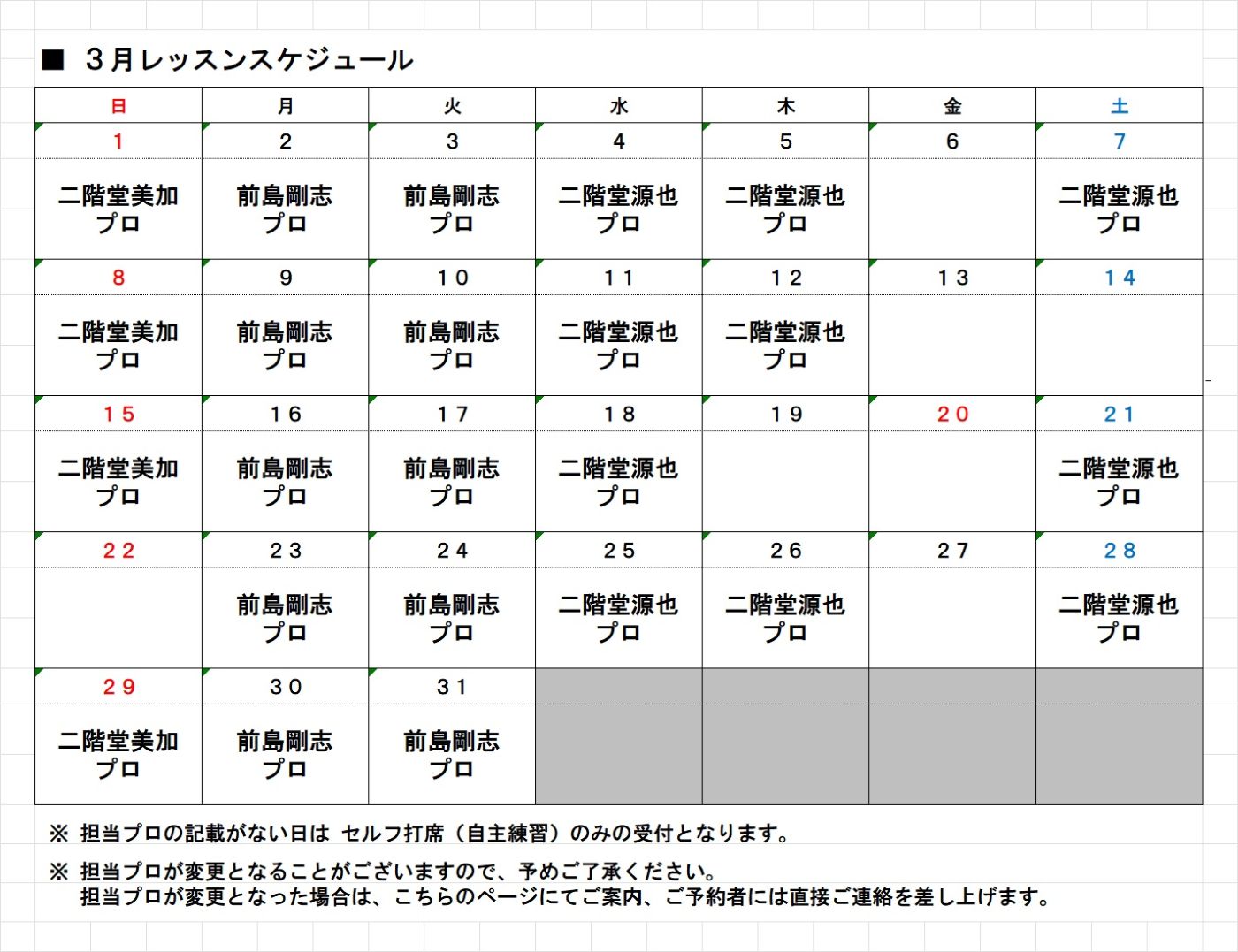3月のレッスンスケジュール(プロの出勤日)が確定いたしましたので、レッスンスケジュールを公開させていただきます。